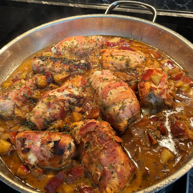 - Jedes Hähnchenstück mit Frühstücksspeck belegen