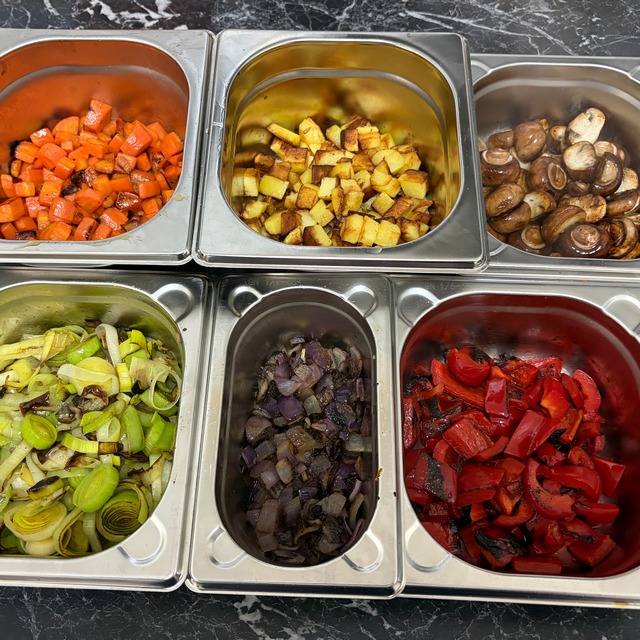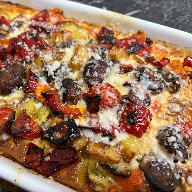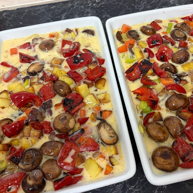• Die Eiermilch über das gebratene Gemüse in den Auflaufformen gießen