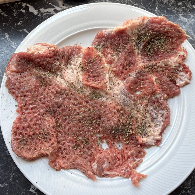 • Das plattierte Fleisch mit Pfeffer, Salz und Thymian kräftig würzen