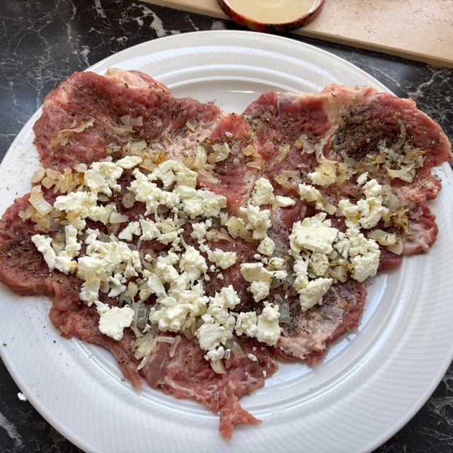 • Die Zwiebel/Knoblauch Mischung auf den Steaks verteilen, dabei einen Rand lassen