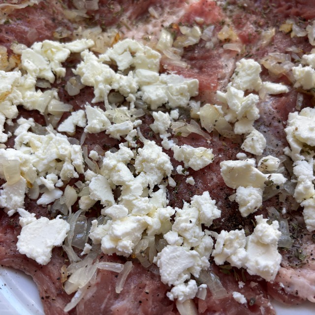 • Die Fetakrümmel nun auf den Zwiebeln verteilen und dabei ebenfalls einen Rand lassen