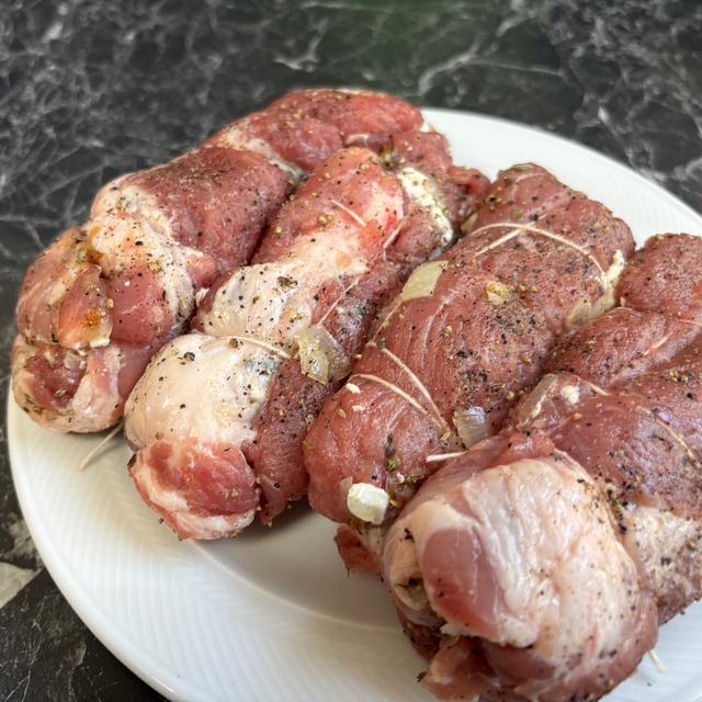 • Nun bei jeder Roulade links und rechts da Fleisch ein wenig nach innen klappen, das beim Grillen nichts herausfällt oder läuft