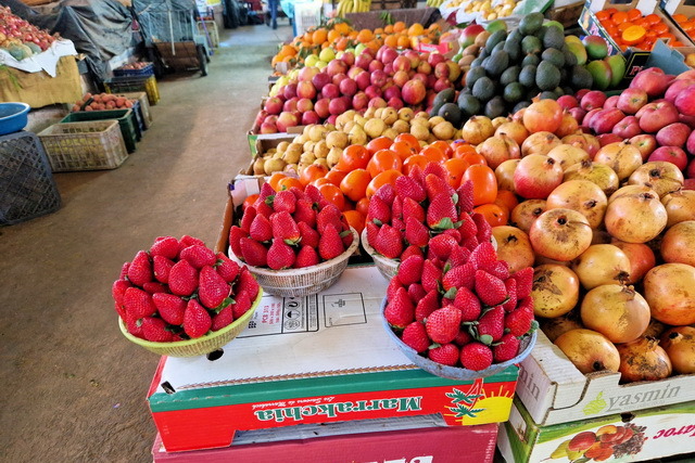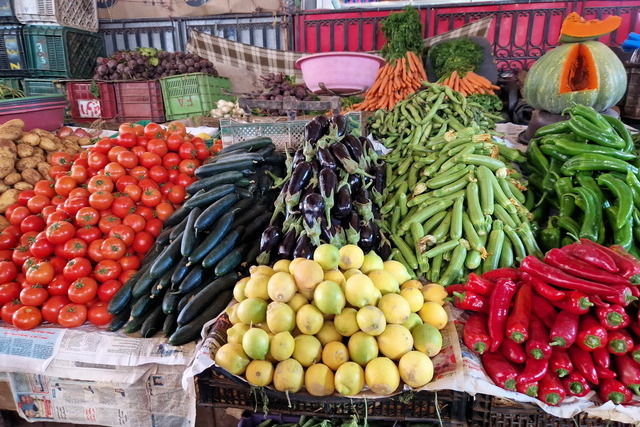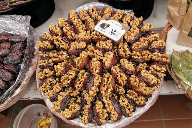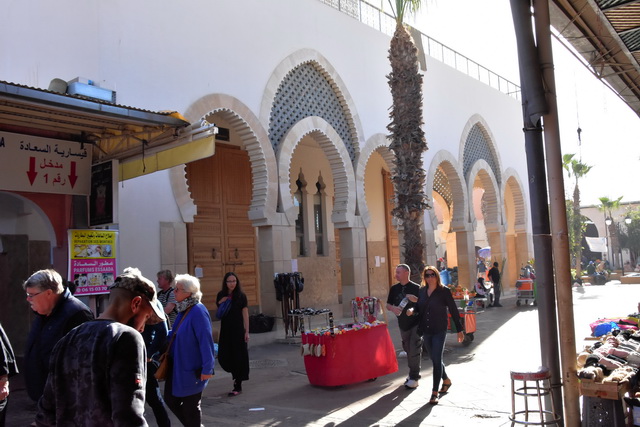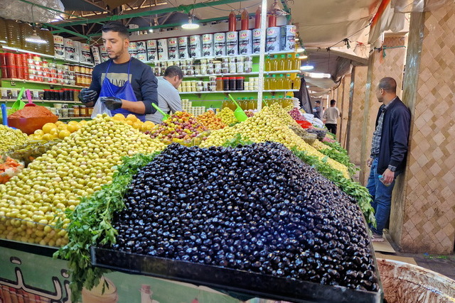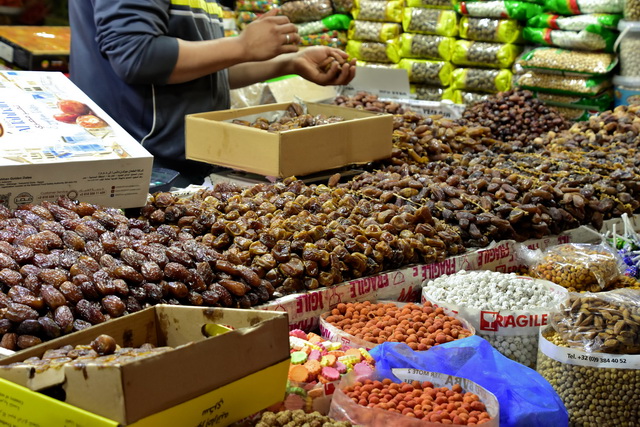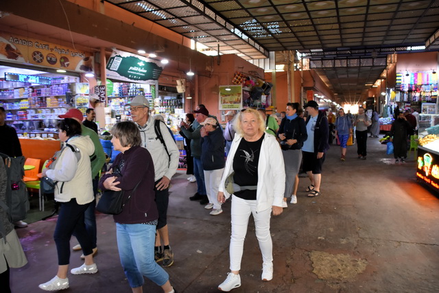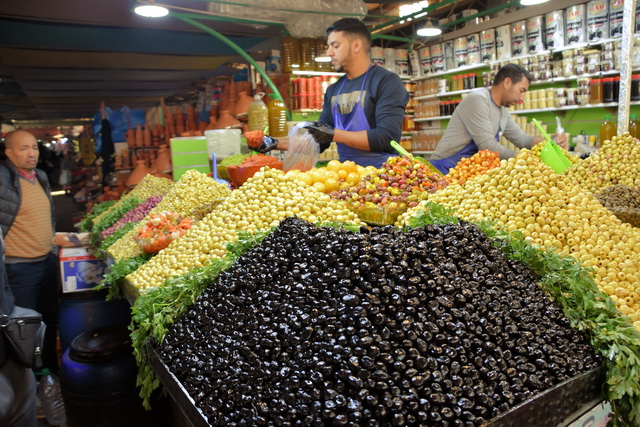 Nach der Show ging es weiter zum großen Souk in der Innenstadt von Agadir. Ein Souk ist in arabischen Städten eine riesige Markthalle, in der es alles zu kaufen gibt, was man sich vorstellen kann. Während uns Klamotten und Haushaltsartikel weniger interessierten, waren wir fasziniert von den landwirtschaftlichen Produkten. Das Angebot war überwältigend: Früchte und Gemüse in allen erdenklichen Größen, Farben und Formen. Besonders beeindruckten uns die Oliven in Rot- und Gelbtönen, der riesige Brokkoli, der fast so groß wie ein Wirsing war und die Gewürzstände, die mit ihren leuchtenden Farben und intensiven Düften unsere Sinne verzauberten.