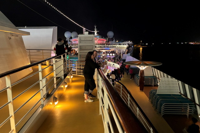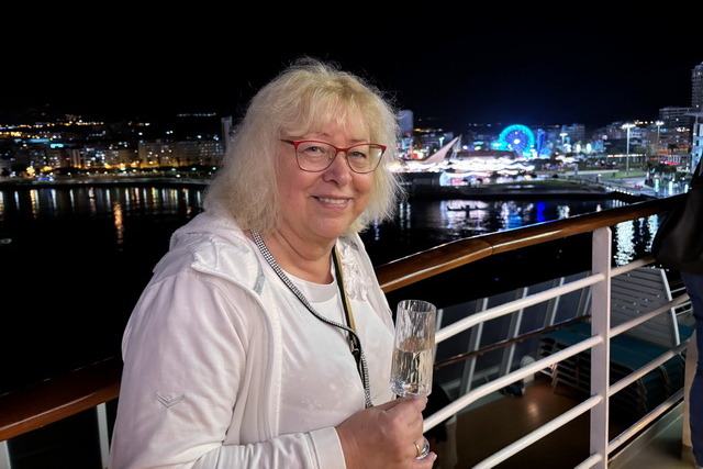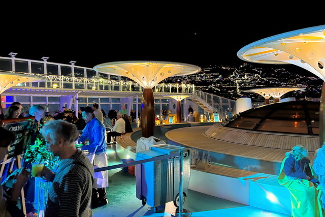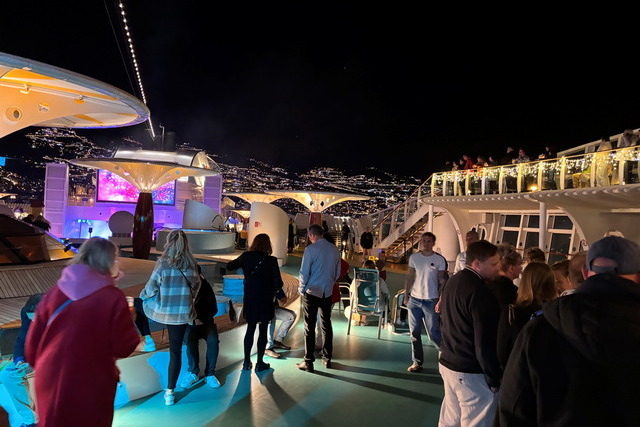 Das sanfte Schaukeln des Schiffes, kombiniert mit der magischen Beleuchtung und der Musik, sorgte für eine einmalige Atmosphäre. Langsam entfernte sich das Schiff vom Hafen und die leuchtenden Lichter der Insel wurden immer kleiner. Die Vorfreude auf unser erstes Ziel – Madeira – lag spürbar in der Luft.