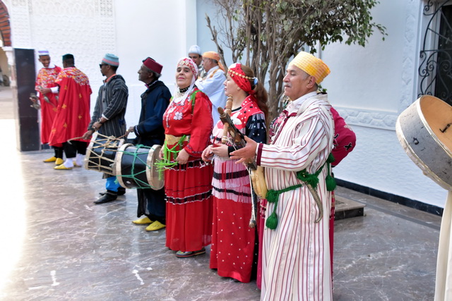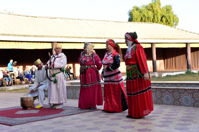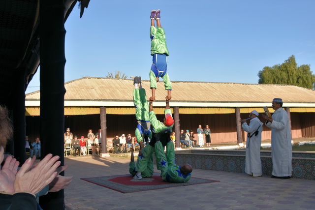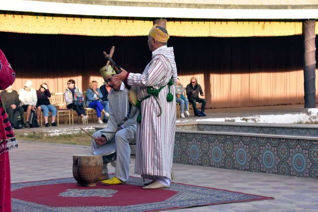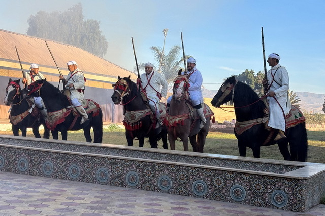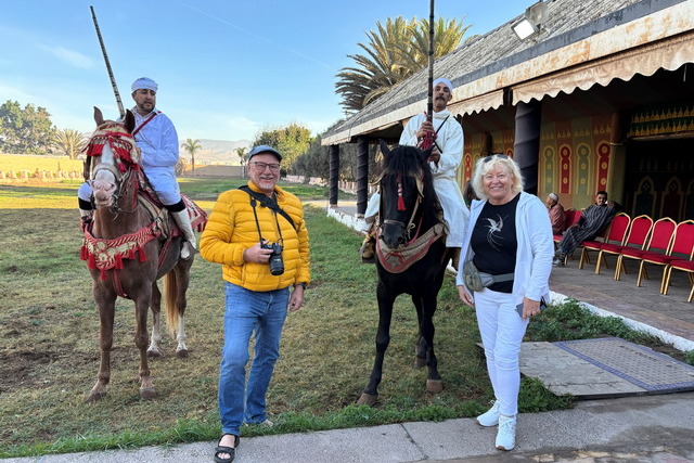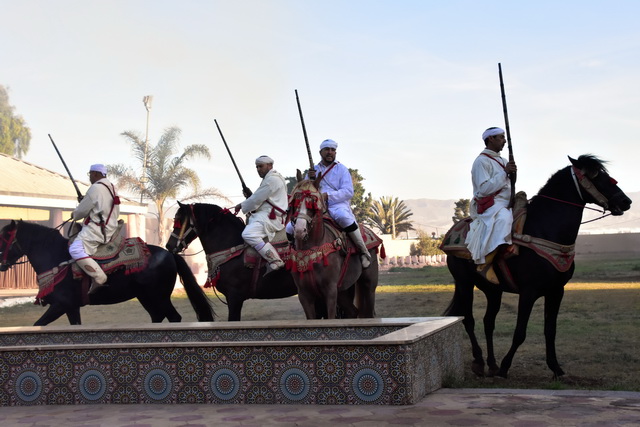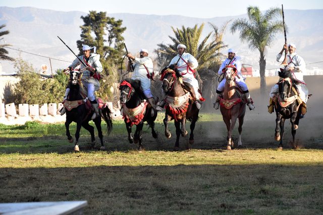 Unser erstes Ziel in Agadir war eine Veranstaltung namens „Fantasia“. Nach einer kurzen Busfahrt erreichten wir ein großes Areal, das von niedrigen Gebäuden im arabischen Stil umgeben war. Durch die Fenster konnte man sehen, dass sich in den Gebäuden unterschiedlich große Veranstaltungsräume befanden, die alle liebevoll mit arabischen Ornamenten dekoriert waren. Diese Räume umrahmten einen zentralen Platz, auf dem eine beeindruckende Show stattfand.