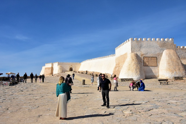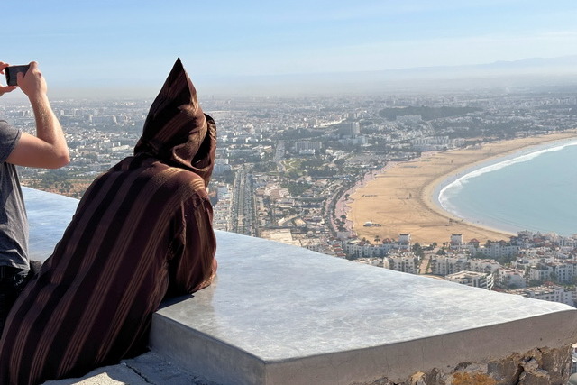 Zum Abschluss des Tages fuhren wir auf einen Aussichtspunkt über der Stadt. Dort thront die Speicherburg Id Aissa, auch bekannt als Agadir Id Aissa, über die Bergkuppe. Die restaurierte Burg selbst war leider nicht zugänglich, aber der Blick von hier oben war atemberaubend. Von diesem Punkt aus konnten wir die gesamte Stadt und die Küste überblicken. Ein wunderschöner Abschluss eines erlebnisreichen Tages.