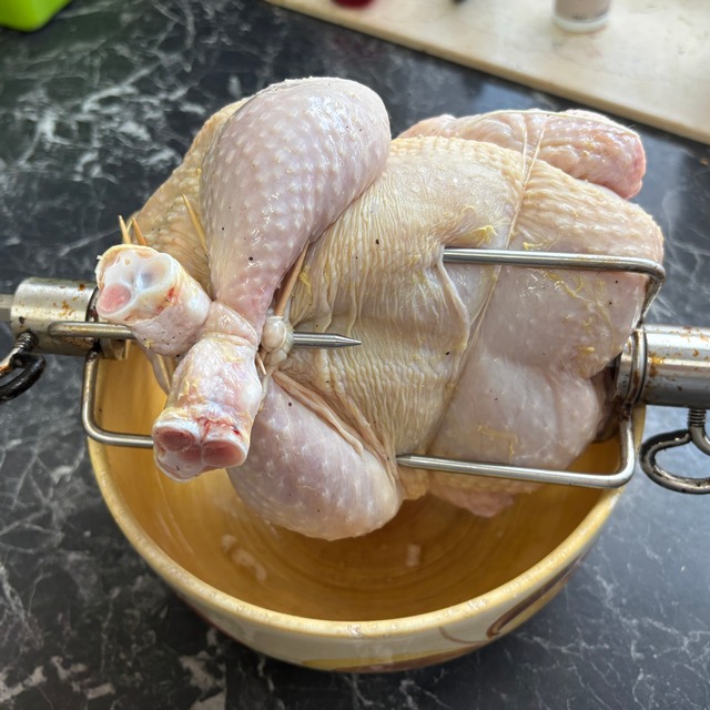 - Das Hühnchen nun entweder auf einen Grillspieß stecken und grillen oder in einer Auflaufform im Backofen backen