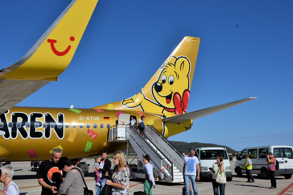Mitte Juni sind wir mit Tochter und Enkel für zwei Wochen nach Ibiza geflogen. Wie groß war die Überraschung für Enkel und Tochter: wir flogen mit dem Haribo-Gummibärenflieger. Ich gebe zu, auch mir hat der knallbunte Gummibärchenflieger von TUI-Fly sehr gut gefallen.